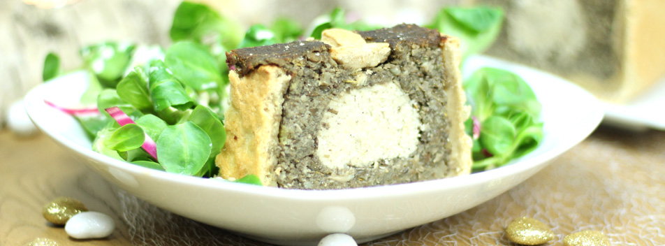 J’ai opté pour une recette aux goûts plus traditionnels avec un insert façon « »pâté de foie » »(gros guillemets). Idéal en entrée ou en plat, vous pourrez nourrir une belle dizaine de convives avec ces proportions. Vos hôtes omnivores apprécieront également ce pâté croûte.