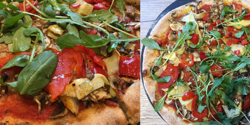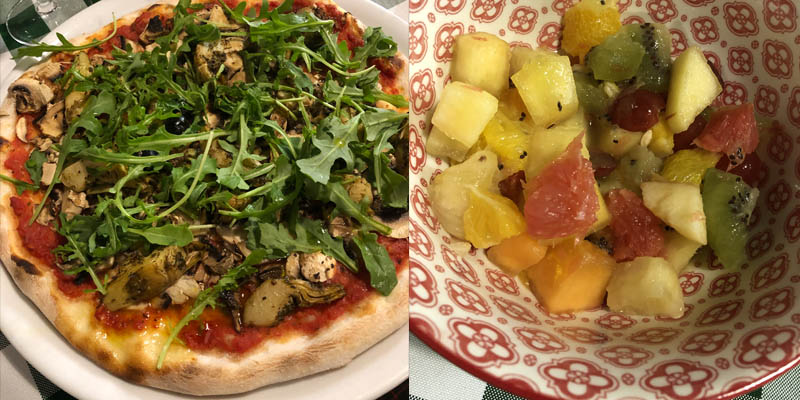 J’avais pris la pizza 4 saisons et j’ai demandé à enlever le fromage et le jambon. En insistant un peu, j’ai pu avoir des légumes en plus sur la pizza. Et en dessert une salade de fruits (frais quand même).